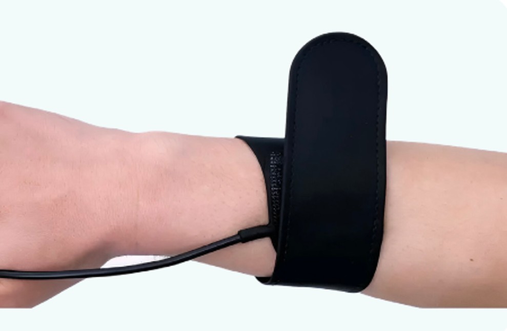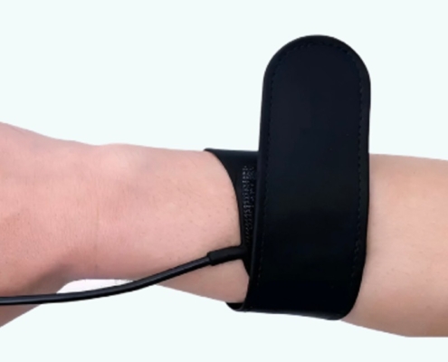 Su brazalete (electrodo neutro) colocado en la muñeca derecha asegura un retorno confiable de la corriente, reduciendo riesgos y protegiendo al paciente durante la intervención.